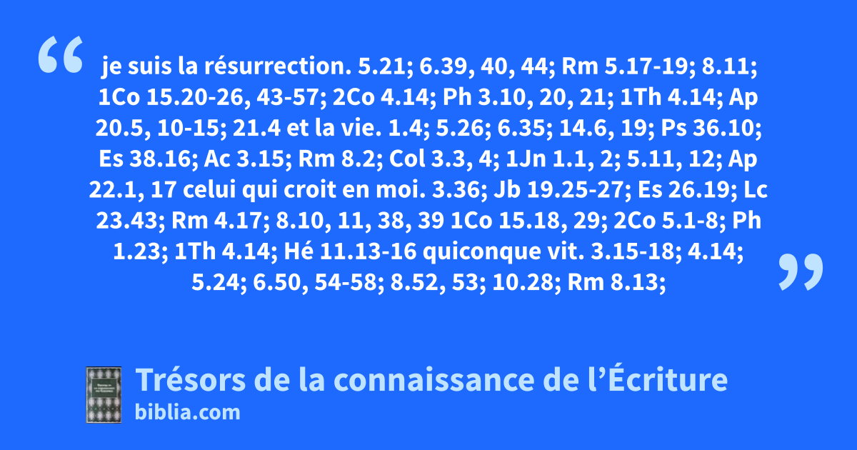 je suis la résurrection. 5.21; 6.39, 40, 44; Rm 5.17-19; 8.11; 1Co 15.20-26, 43-57; 2Co 4.14; Ph 3.10, 20, 21; 1Th 4.14; Ap 20.5, 10-15; 21.4 et la vie. 1.4; 5.26; 6.35; 14.6, 19; Ps 36.10; Es 38.16; Ac 3.15; Rm 8.2; Col 3.3, 4; 1Jn 1.1, 2; 5.11, 12; Ap 22.1, 17 celui qui croit en moi. 3.36; Jb 19.25-27; Es 26.19; Lc 23.43; Rm 4.17; 8.10, 11, 38, 39 1Co 15.18, 29; 2Co 5.1-8; Ph 1.23; 1Th 4.14; Hé 11.13-16