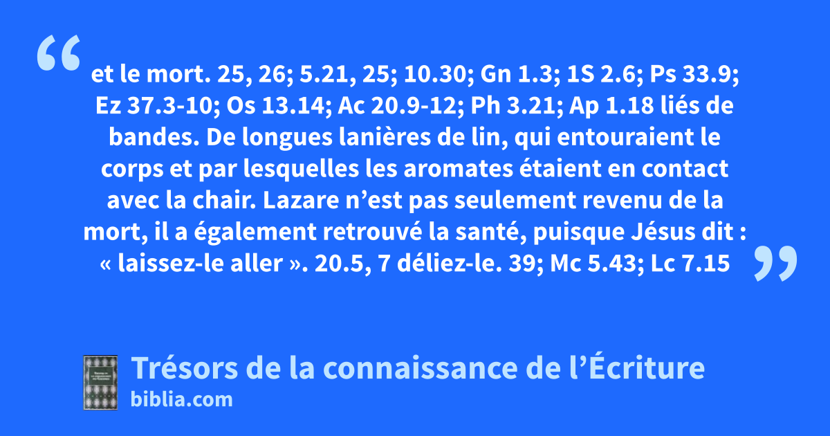 et le mort. 25, 26; 5.21, 25; 10.30; Gn 1.3; 1S 2.6; Ps 33.9; Ez 37.3-10; Os 13.14; Ac 20.9-12; Ph 3.21; Ap 1.18 liés de bandes. De longues lanières de lin, qui entouraient le corps et par lesquelles les aromates étaient en contact avec la chair. Lazare n’est pas seulement revenu de la mort, il a également retrouvé la santé, puisque Jésus dit : « laissez-le aller ». 20.5, 7 déliez-le. 39; Mc 5.43; Lc 7.15