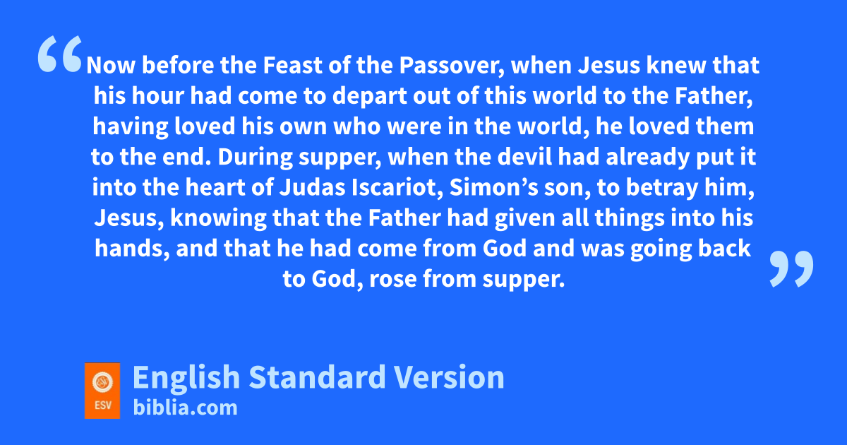 13 Now nbefore othe Feast of the Passover, when Jesus knew that phis hour had come qto depart out of this world to the Father, rhaving loved shis own who were in the world, he loved them to the end. 2 During supper, when tthe devil had already put it into the heart of Judas Iscariot, Simon’s son, to betray him, 3 Jesus, knowing uthat the Father had given all things into his hands, and that vhe had come from God and wwas going back to God, 4 rose from supper. He laid aside his outer garments, and taking a towel, xtied it around his waist. 5 Then he ypoured water into a basin and began to wash the disciples’ feet and to wipe them with the towel that was wrapped around him. 6 He came to Simon Peter, who said to him, “Lord, do you wash my feet?” 7 zJesus answered him, “What I am doing ayou do not understand now, but afterward you will understand.” 8 bPeter said to him, “You shall never wash my feet.” Jesus answered him, c“If I do not wash you, you have no share with me.” 9 Simon Peter said to him, “Lord, not my feet only but also my hands and my head!” 10 Jesus said to him, “The one who has bathed does not need to wash, dexcept for his feet,1 but is completely clean. And eyou2 are clean, fbut not every one of you.” 11 gFor he knew who was to betray him; that was why he said, “Not all of you are clean.”