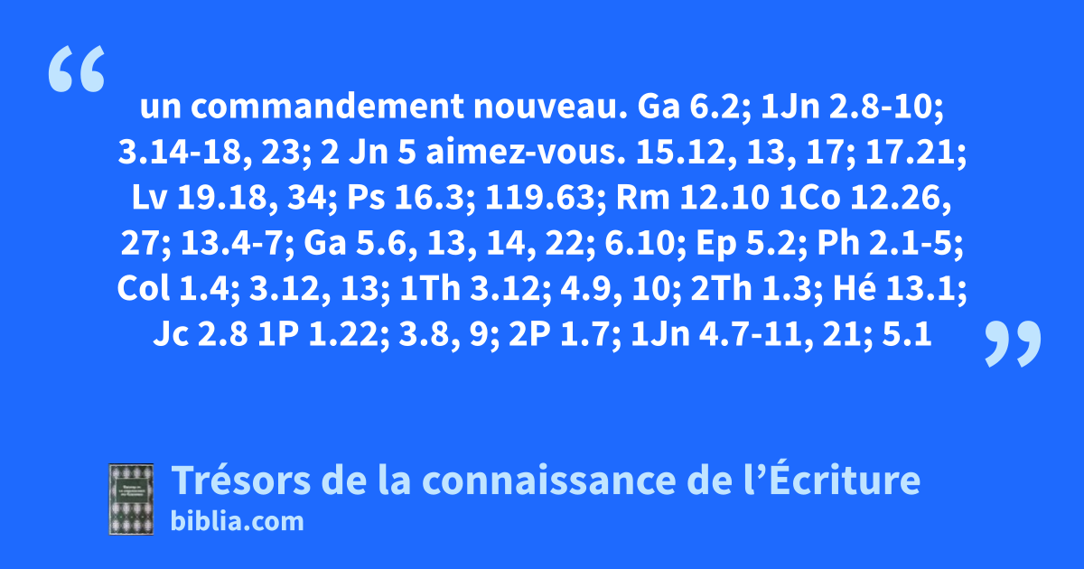 un commandement nouveau. Ga 6.2; 1Jn 2.8-10; 3.14-18, 23; 2 Jn 5 aimez-vous. 15.12, 13, 17; 17.21; Lv 19.18, 34; Ps 16.3; 119.63; Rm 12.10 1Co 12.26, 27; 13.4-7; Ga 5.6, 13, 14, 22; 6.10; Ep 5.2; Ph 2.1-5; Col 1.4; 3.12, 13; 1Th 3.12; 4.9, 10; 2Th 1.3; Hé 13.1; Jc 2.8 1P 1.22; 3.8, 9; 2P 1.7; 1Jn 4.7-11, 21; 5.1