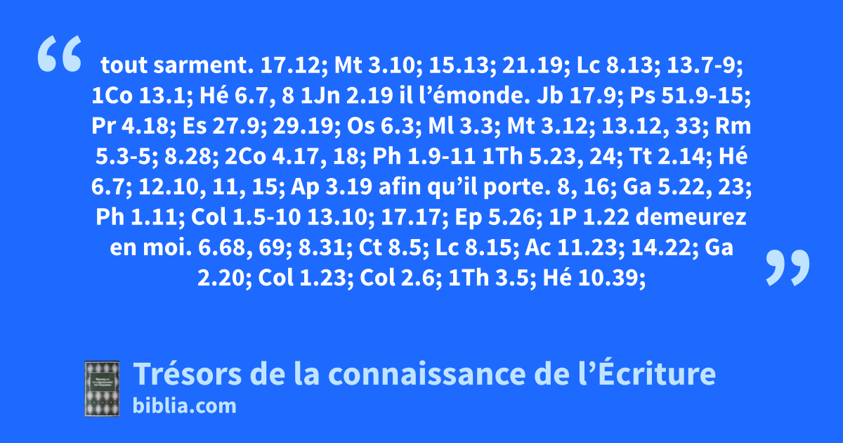 tout sarment. 17.12; Mt 3.10; 15.13; 21.19; Lc 8.13; 13.7-9; 1Co 13.1; Hé 6.7, 8 1Jn 2.19 il l’émonde. Jb 17.9; Ps 51.9-15; Pr 4.18; Es 27.9; 29.19; Os 6.3; Ml 3.3; Mt 3.12; 13.12, 33; Rm 5.3-5; 8.28; 2Co 4.17, 18; Ph 1.9-11 1Th 5.23, 24; Tt 2.14; Hé 6.7; 12.10, 11, 15; Ap 3.19 afin qu’il porte. 8, 16; Ga 5.22, 23; Ph 1.11; Col 1.5-10
