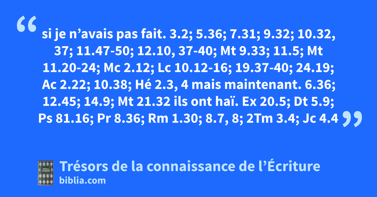 si je n’avais pas fait. 3.2; 5.36; 7.31; 9.32; 10.32, 37; 11.47-50; 12.10, 37-40; Mt 9.33; 11.5; Mt 11.20-24; Mc 2.12; Lc 10.12-16; 19.37-40; 24.19; Ac 2.22; 10.38; Hé 2.3, 4 mais maintenant. 6.36; 12.45; 14.9; Mt 21.32 ils ont haï. Ex 20.5; Dt 5.9; Ps 81.16; Pr 8.36; Rm 1.30; 8.7, 8; 2Tm 3.4; Jc 4.4