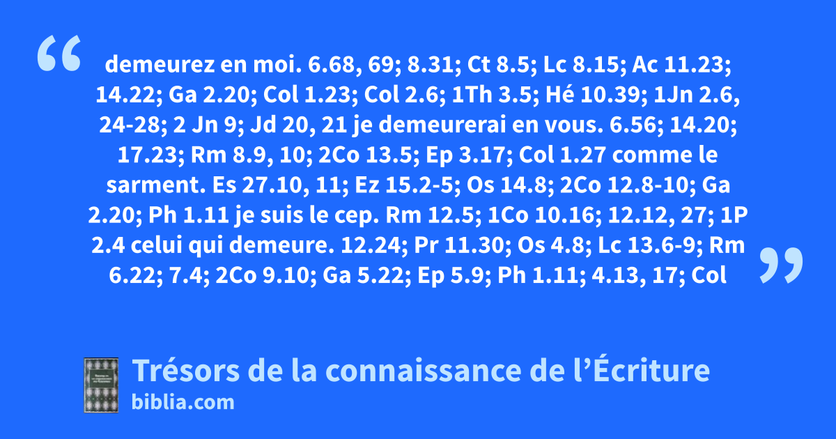 demeurez en moi. 6.68, 69; 8.31; Ct 8.5; Lc 8.15; Ac 11.23; 14.22; Ga 2.20; Col 1.23; Col 2.6; 1Th 3.5; Hé 10.39; 1Jn 2.6, 24-28; 2 Jn 9; Jd 20, 21 je demeurerai en vous. 6.56; 14.20; 17.23; Rm 8.9, 10; 2Co 13.5; Ep 3.17; Col 1.27 comme le sarment. Es 27.10, 11; Ez 15.2-5; Os 14.8; 2Co 12.8-10; Ga 2.20; Ph 1.11