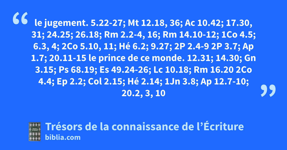 le jugement. 5.22-27; Mt 12.18, 36; Ac 10.42; 17.30, 31; 24.25; 26.18; Rm 2.2-4, 16; Rm 14.10-12; 1Co 4.5; 6.3, 4; 2Co 5.10, 11; Hé 6.2; 9.27; 2P 2.4-9 2P 3.7; Ap 1.7; 20.11-15 le prince de ce monde. 12.31; 14.30; Gn 3.15; Ps 68.19; Es 49.24-26; Lc 10.18; Rm 16.20 2Co 4.4; Ep 2.2; Col 2.15; Hé 2.14; 1Jn 3.8; Ap 12.7-10; 20.2, 3, 10