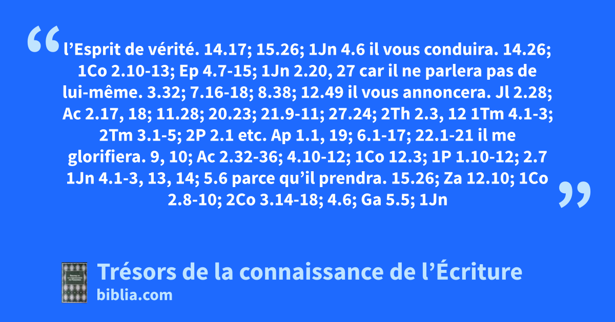 l’Esprit de vérité. 14.17; 15.26; 1Jn 4.6 il vous conduira. 14.26; 1Co 2.10-13; Ep 4.7-15; 1Jn 2.20, 27 car il ne parlera pas de lui-même. 3.32; 7.16-18; 8.38; 12.49 il vous annoncera. Jl 2.28; Ac 2.17, 18; 11.28; 20.23; 21.9-11; 27.24; 2Th 2.3, 12 1Tm 4.1-3; 2Tm 3.1-5; 2P 2.1 etc. Ap 1.1, 19; 6.1-17; 22.1-21