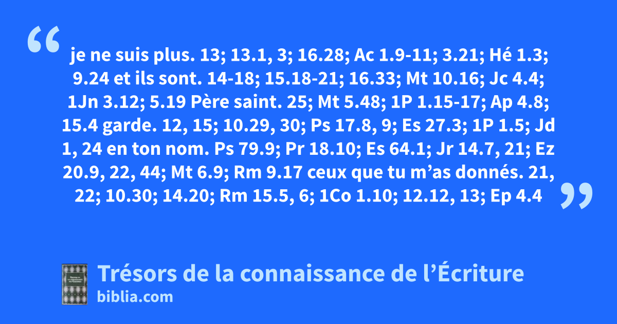 je ne suis plus. 13; 13.1, 3; 16.28; Ac 1.9-11; 3.21; Hé 1.3; 9.24 et ils sont. 14-18; 15.18-21; 16.33; Mt 10.16; Jc 4.4; 1Jn 3.12; 5.19 Père saint. 25; Mt 5.48; 1P 1.15-17; Ap 4.8; 15.4 garde. 12, 15; 10.29, 30; Ps 17.8, 9; Es 27.3; 1P 1.5; Jd 1, 24 en ton nom. Ps 79.9; Pr 18.10; Es 64.1; Jr 14.7, 21; Ez 20.9, 22, 44; Mt 6.9; Rm 9.17 ceux que tu m’as donnés. 21, 22; 10.30; 14.20; Rm 15.5, 6; 1Co 1.10; 12.12, 13; Ep 4.4