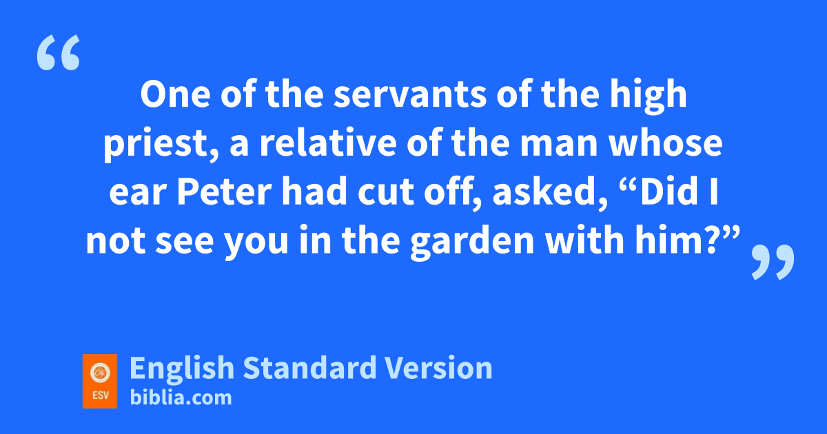 25 mNow Simon Peter was standing and warming himself. So they said to him, “You also are not one of his disciples, are you?” He denied it and said, “I am not.” 26 One of the servants of the high priest, a relative of nthe man whose ear Peter had cut off, asked, “Did I not see you oin the garden with him?” 27 Peter again denied it, and pat once a rooster crowed.