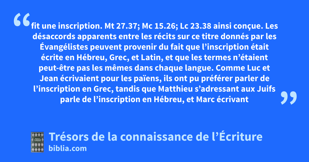fit une inscription. Mt 27.37; Mc 15.26; Lc 23.38 ainsi conçue. Les désaccords apparents entre les récits sur ce titre donnés par les Évangélistes peuvent provenir du fait que l’inscription était écrite en Hébreu, Grec, et Latin, et que les termes n’étaient peut-être pas les mêmes dans chaque langue. Comme Luc et Jean écrivaient pour les païens, ils ont pu préférer parler de l’inscription en Grec, tandis que Matthieu s’adressant aux Juifs parle de l’inscription en Hébreu, et Marc écrivant pour les Romains traduit l’inscription en Latin. Jésus de Nazareth, roi des Juifs. 3, 12; 1.45, 46, 49; 18.33; Ac 3.6; 26.9