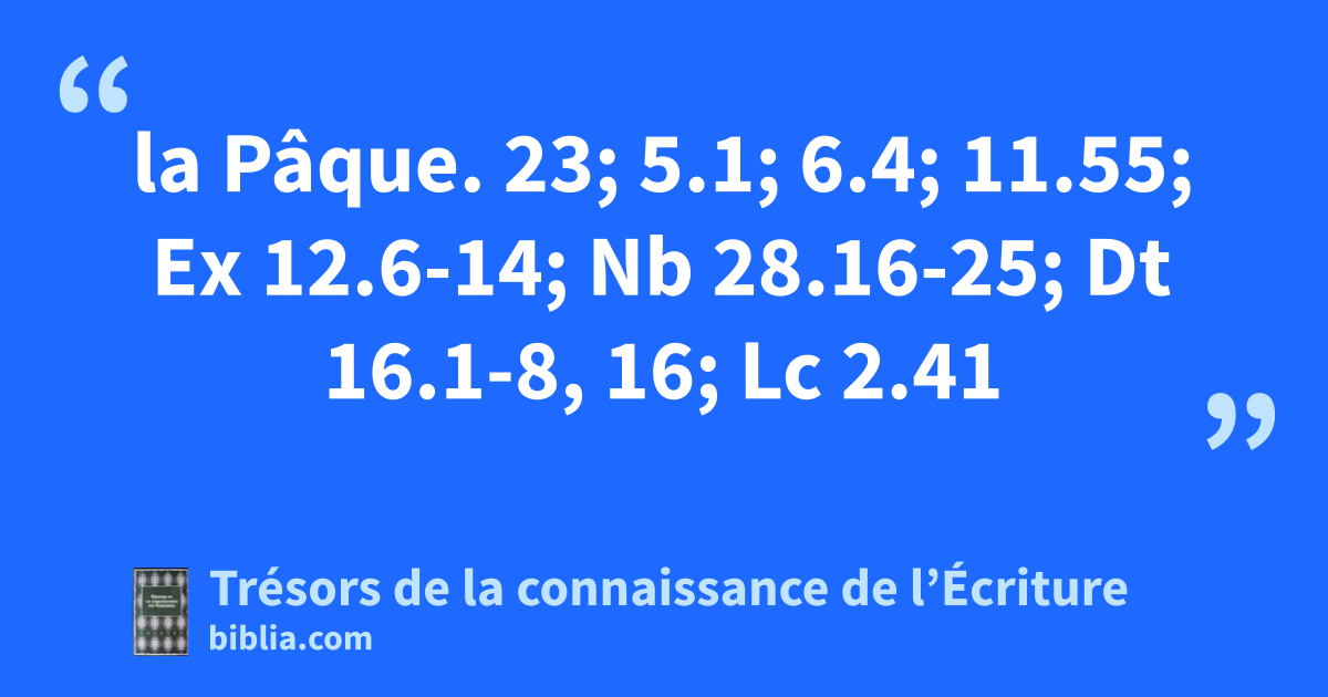 la Pâque. 23; 5.1; 6.4; 11.55; Ex 12.6-14; Nb 28.16-25; Dt 16.1-8, 16; Lc 2.41