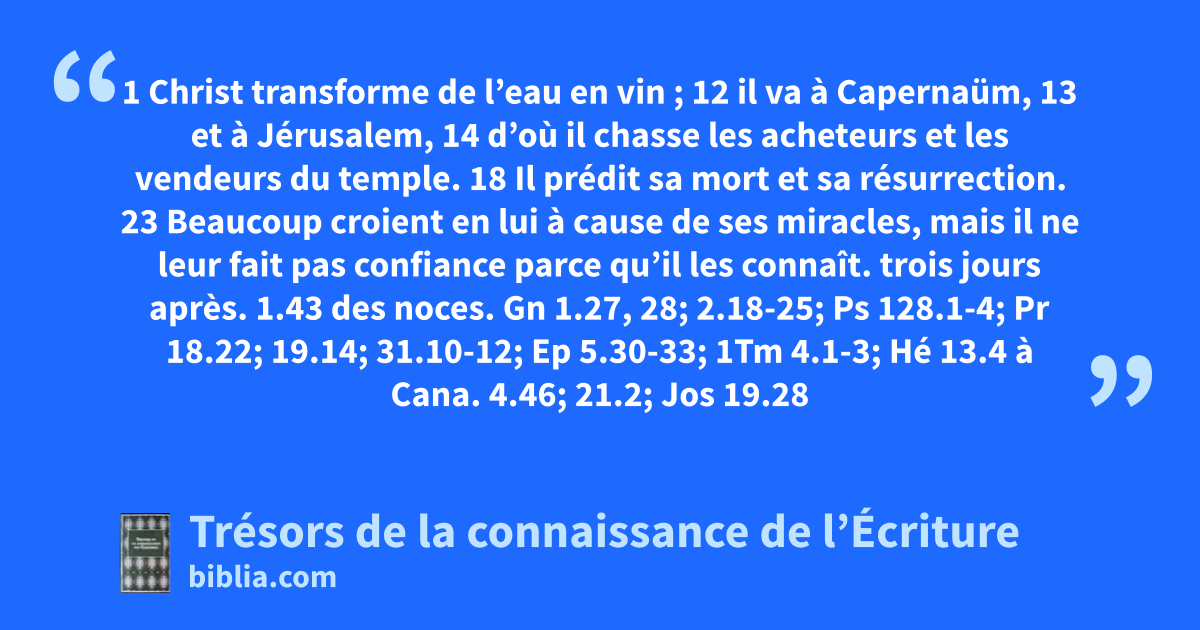 1 Christ transforme de l’eau en vin ; 12 il va à Capernaüm, 13 et à Jérusalem, 14 d’où il chasse les acheteurs et les vendeurs du temple. 18 Il prédit sa mort et sa résurrection. 23 Beaucoup croient en lui à cause de ses miracles, mais il ne leur fait pas confiance parce qu’il les connaît.