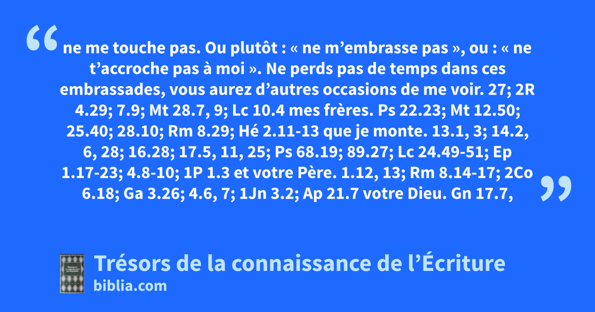 ne me touche pas. Ou plutôt : « ne m’embrasse pas », ou : « ne t’accroche pas à moi ». Ne perds pas de temps dans ces embrassades, vous aurez d’autres occasions de me voir. 27; 2R 4.29; 7.9; Mt 28.7, 9; Lc 10.4 mes frères. Ps 22.23; Mt 12.50; 25.40; 28.10; Rm 8.29; Hé 2.11-13 que je monte. 13.1, 3; 14.2, 6, 28; 16.28; 17.5, 11, 25; Ps 68.19; 89.27; Lc 24.49-51; Ep 1.17-23; 4.8-10; 1P 1.3 et votre Père. 1.12, 13; Rm 8.14-17; 2Co 6.18; Ga 3.26; 4.6, 7; 1Jn 3.2; Ap 21.7 votre Dieu. Gn 17.7, 8; Ps 43.4; 48.15; Es 41.10; Jr 31.33; 32.38; Ez 36.28; Ez 37.27; Za 13.7-9; Hé 8.10; 11.16; Ap 21.3