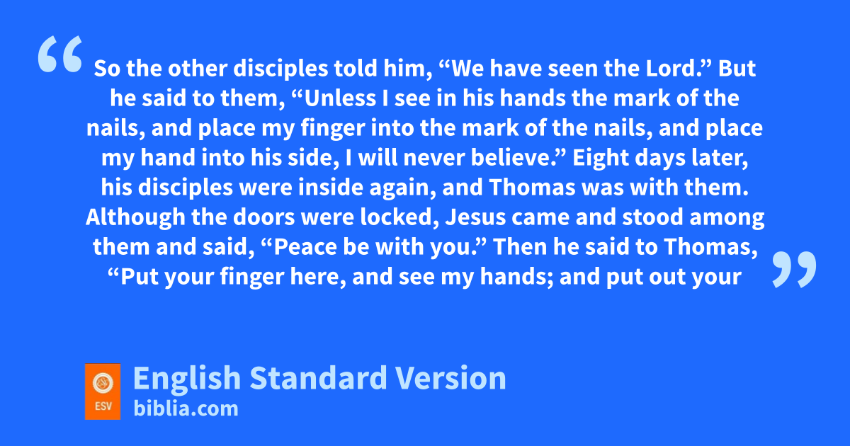 24 Now oThomas, one of the twelve, called the Twin,4 was not with them when Jesus came. 25 So the other disciples told him, “We have seen the Lord.” But he said to them, p“Unless I see in his hands the mark of the nails, and place my finger into the mark of the nails, and place my hand into his side, I will never believe.”