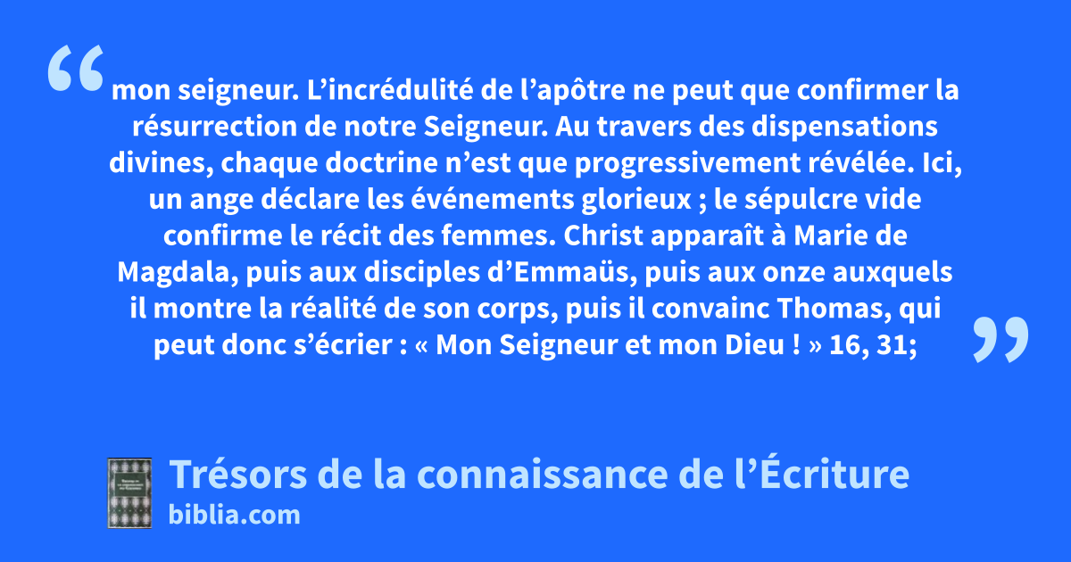 mon seigneur. L’incrédulité de l’apôtre ne peut que confirmer la résurrection de notre Seigneur. Au travers des dispensations divines, chaque doctrine n’est que progressivement révélée. Ici, un ange déclare les événements glorieux ; le sépulcre vide confirme le récit des femmes. Christ apparaît à Marie de Magdala, puis aux disciples d’Emmaüs, puis aux onze auxquels il montre la réalité de son corps, puis il convainc Thomas, qui peut donc s’écrier : « Mon Seigneur et mon Dieu ! » 16, 31; 5.23; 9.35-38; Ps 45.7, 12; 102.25-29; 118.24-28; Es 7.14; 9.5; 25.9; Es 40.9-11; Jr 23.5, 6; Ml 3.1; Mt 14.33; Lc 24.52; Ac 7.59, 60 1Tm 3.16; Ap 5.9-14