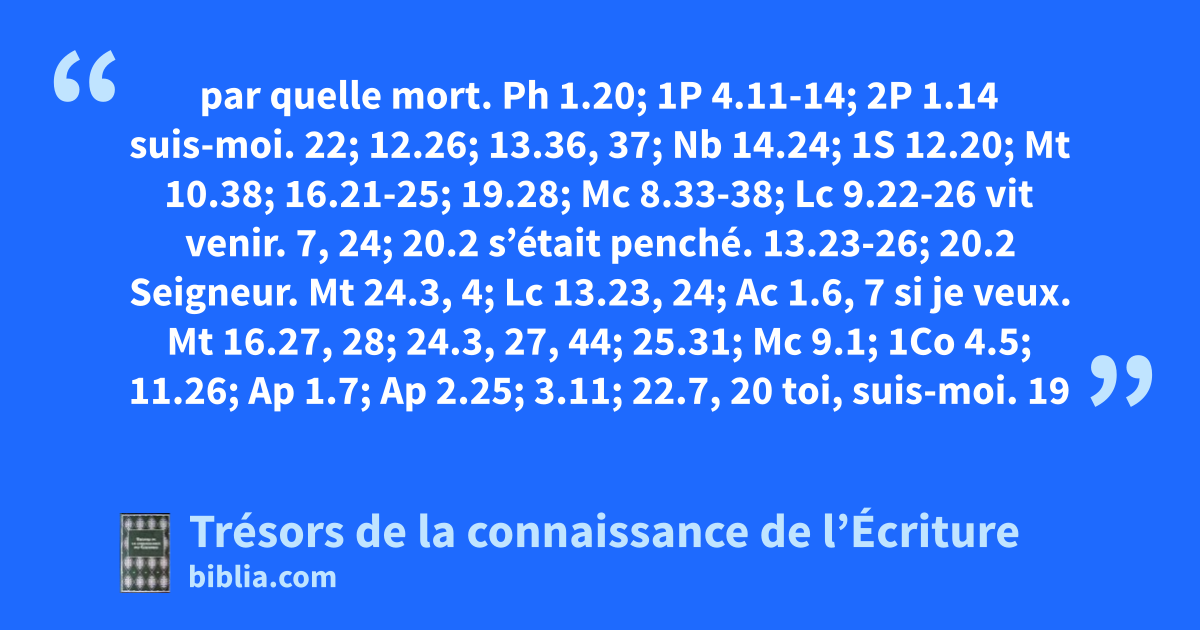 par quelle mort. Ph 1.20; 1P 4.11-14; 2P 1.14 suis-moi. 22; 12.26; 13.36, 37; Nb 14.24; 1S 12.20; Mt 10.38; 16.21-25; 19.28; Mc 8.33-38; Lc 9.22-26