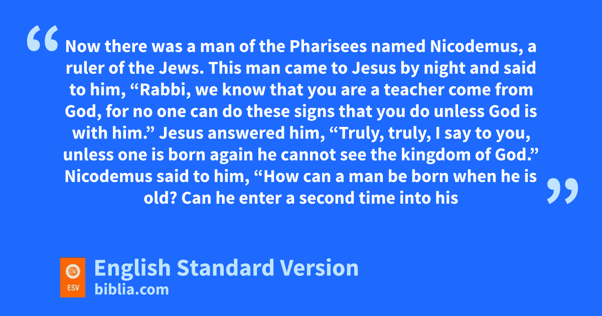 3 Now there was a man of the Pharisees named hNicodemus, ia ruler of the Jews. 2 This man came to Jesus1 jby night and said to him, k“Rabbi, lwe know that you are a teacher come from God, for no one can do these signs that you do munless God is with him.” 3 Jesus answered him, “Truly, truly, I say to you, unless one is nborn oagain2 he cannot psee the kingdom of God.” 4 Nicodemus said to him, “How can a man be born when he is old? Can he enter a second time into his mother’s womb and be born?” 5 Jesus answered, “Truly, truly, I say to you, unless one is born qof water and the Spirit, he cannot enter the kingdom of God. 6 rThat which is born of the flesh is sflesh, and that which is born of the Spirit is spirit.3 7 tDo not marvel that I said to you, ‘You4 must be born uagain.’ 8 vThe wind5 blows wwhere it wishes, and you hear its sound, but you do not know where it comes from or where it goes. So it is with everyone who is born of the Spirit.”