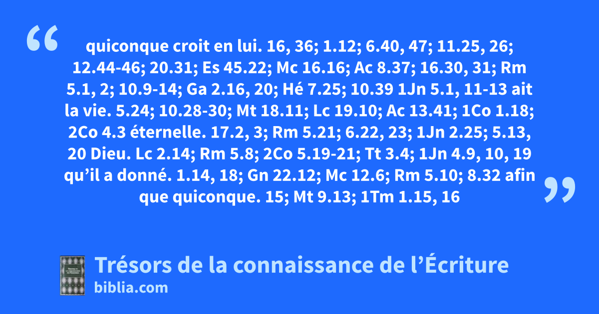 quiconque croit en lui. 16, 36; 1.12; 6.40, 47; 11.25, 26; 12.44-46; 20.31; Es 45.22; Mc 16.16; Ac 8.37; 16.30, 31; Rm 5.1, 2; 10.9-14; Ga 2.16, 20; Hé 7.25; 10.39 1Jn 5.1, 11-13 ait la vie. 5.24; 10.28-30; Mt 18.11; Lc 19.10; Ac 13.41; 1Co 1.18; 2Co 4.3 éternelle. 17.2, 3; Rm 5.21; 6.22, 23; 1Jn 2.25; 5.13, 20