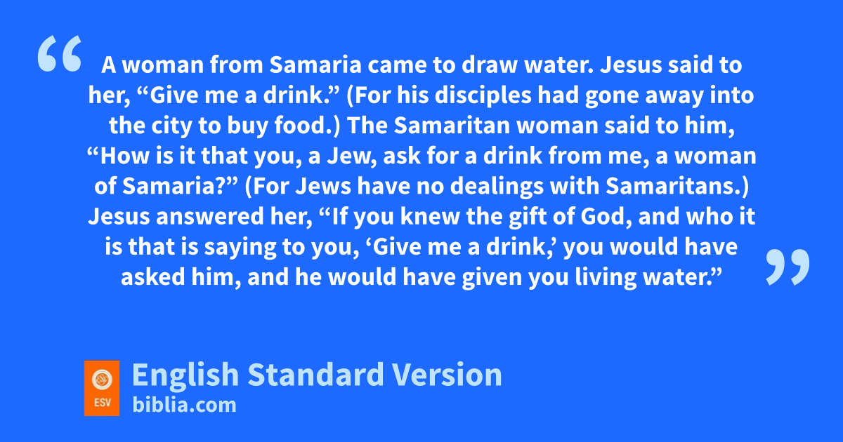 7 A woman from Samaria came to draw water. Jesus said to her, f“Give me a drink.” 8 (For his disciples had gone away into the city to buy food.) 9 The Samaritan woman said to him, “How is it that you, a Jew, ask for a drink from me, a woman of Samaria?” (gFor Jews have no dealings with Samaritans.) 10 Jesus answered her, “If you knew the gift of God, and who it is that is saying to you, ‘Give me a drink,’ you would have asked him, and he would have given you hliving water.” 11 The woman said to him, “Sir, you have nothing to draw water with, and the well is deep. Where do you get that living water? 12 iAre you greater than our father Jacob? jHe gave us the well and drank from it himself, as did his sons and his livestock.” 13 Jesus said to her, “Everyone who drinks of this water will be thirsty again, 14 but kwhoever drinks of the water that I will give him lwill never be thirsty again.2 The water that I will give him will become min him a spring of water welling up to eternal life.” 15 The woman said to him, “Sir, ngive me this water, so that I will not be thirsty or have to come here to draw water.”