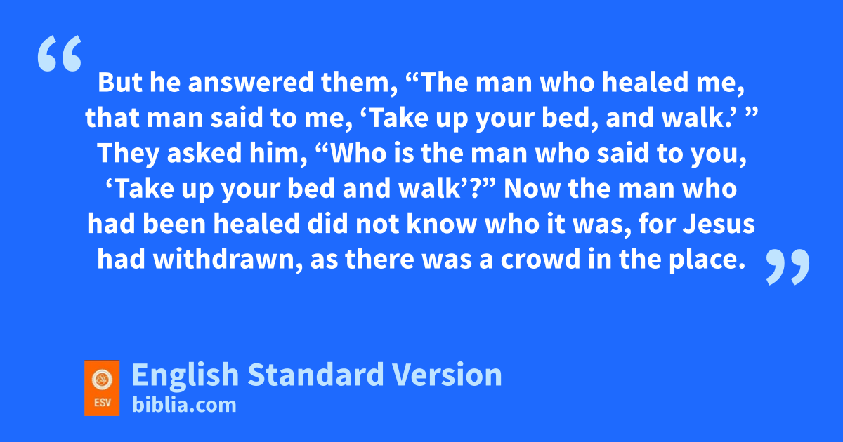 2 Now there is in Jerusalem by pthe Sheep Gate a pool, in Aramaic1 called Bethesda,2 which has five roofed colonnades. 3 In these lay a multitude of invalids—blind, lame, and qparalyzed.3 5 One man was there who had been an invalid for thirty-eight years. 6 When Jesus saw him lying there and knew that he had already been there a long time, he said to him, “Do you want to be healed?” 7 The sick man answered him, “Sir, I have no one to put me into the pool when the water is stirred up, and while I am going another steps down before me.” 8 Jesus said to him, r“Get up, take up your bed, and walk.” 9 rAnd at once the man was healed, and he took up his bed and walked.