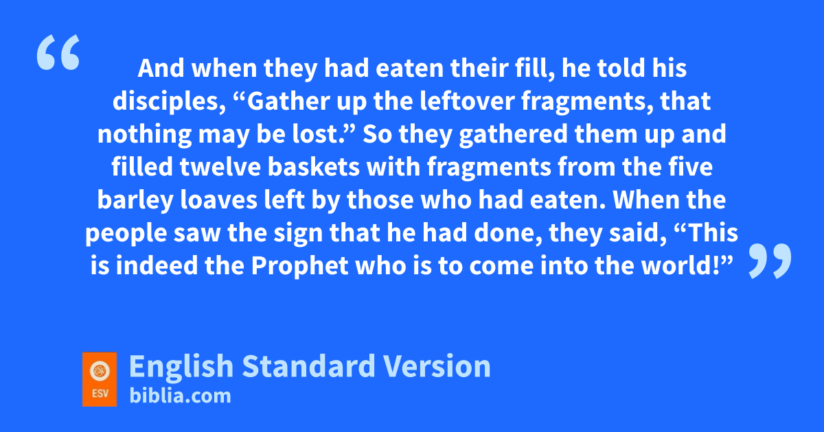 6 After this jJesus went away to the other side of kthe Sea of Galilee, which is lthe Sea of Tiberias. 2 And a large crowd was following him, because they saw the signs that he was doing on the sick. 3 Jesus went up on mthe mountain, and there he sat down with his disciples. 4 Now nthe Passover, the ofeast of the Jews, was at hand. 5 pLifting up his eyes, then, and seeing that a large crowd was coming toward him, Jesus said to qPhilip, “Where are we to buy bread, so that these people may eat?” 6 He said this to test him, for he himself knew what he would do. 7 rPhilip answered him, “Two hundred denarii1 worth of bread would not be enough for each of them to get a little.” 8 One of his disciples, sAndrew, Simon Peter’s brother, said to him, 9 “There is a boy here who has five tbarley loaves and two fish, but twhat are they for so many?” 10 Jesus said, “Have the people sit down.” uNow there was much grass in the place. So the men sat down, about five thousand in number. 11 Jesus then took the loaves, and vwhen he had given thanks, he distributed them to those who were seated. So also the fish, as much as they wanted. 12 And when they had eaten their fill, he told his disciples, “Gather up the leftover fragments, that nothing may be lost.” 13 So they gathered them up and filled twelve baskets with fragments from the five barley loaves left by those who had eaten. 14 When the people saw the sign that he had done, they said, w“This is indeed xthe Prophet ywho is to come into the world!”