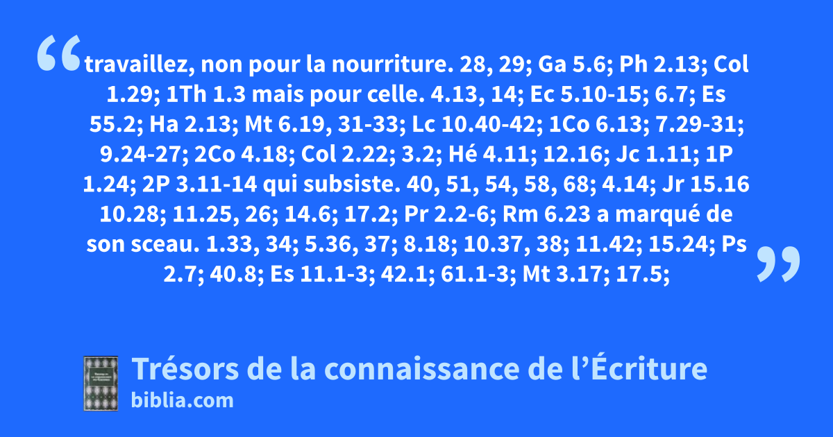 travaillez, non pour la nourriture. 28, 29; Ga 5.6; Ph 2.13; Col 1.29; 1Th 1.3 mais pour celle. 4.13, 14; Ec 5.10-15; 6.7; Es 55.2; Ha 2.13; Mt 6.19, 31-33; Lc 10.40-42; 1Co 6.13; 7.29-31; 9.24-27; 2Co 4.18; Col 2.22; 3.2; Hé 4.11; 12.16; Jc 1.11; 1P 1.24; 2P 3.11-14 qui subsiste. 40, 51, 54, 58, 68; 4.14; Jr 15.16 10.28; 11.25, 26; 14.6; 17.2; Pr 2.2-6; Rm 6.23 a marqué de son sceau. 1.33, 34; 5.36, 37; 8.18; 10.37, 38; 11.42; 15.24; Ps 2.7; 40.8; Es 11.1-3; 42.1; 61.1-3; Mt 3.17; 17.5; Mc 1.11; 9.7; Lc 3.22; Lc 4.18-21; 9.35; Ac 2.22; 10.38; 2P 1.17