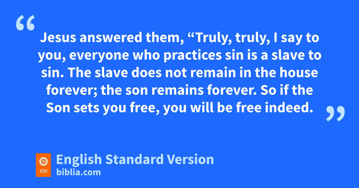 34 Jesus answered them, “Truly, truly, I say to you, geveryone who practices sin is a slave3 to sin. 35 hThe slave does not remain in the house forever; ithe son remains forever. 36 So if the Son sets you free, you will be free indeed. 37 I know that you are offspring of Abraham; yet jyou seek to kill me because my word finds no place in you. 38 kI speak of what I have seen with my Father, and you do what you have heard lfrom your father.”