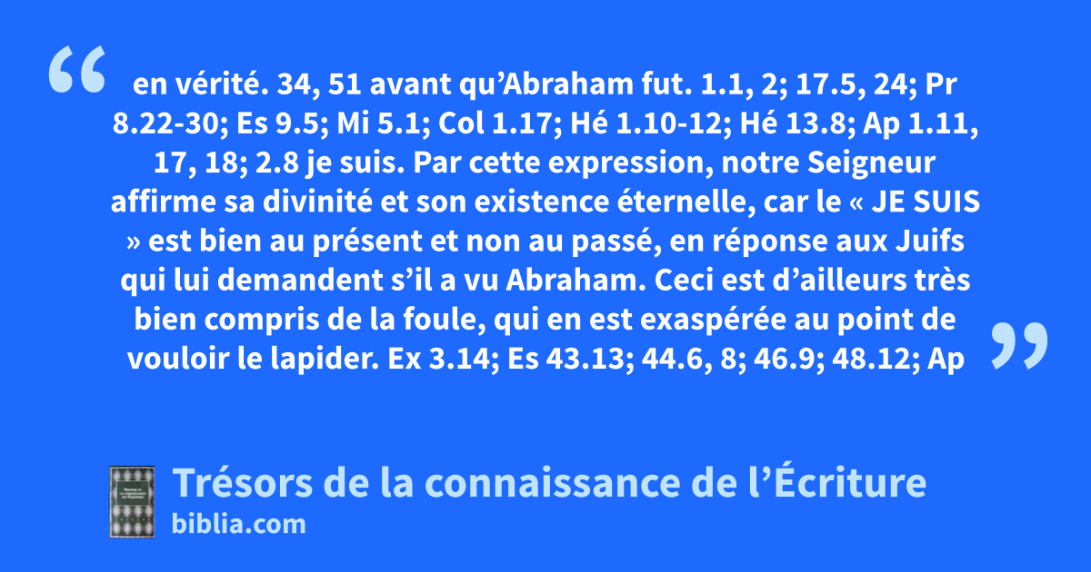 en vérité. 34, 51 avant qu’Abraham fut. 1.1, 2; 17.5, 24; Pr 8.22-30; Es 9.5; Mi 5.1; Col 1.17; Hé 1.10-12; Hé 13.8; Ap 1.11, 17, 18; 2.8 je suis. Par cette expression, notre Seigneur affirme sa divinité et son existence éternelle, car le « JE SUIS » est bien au présent et non au passé, en réponse aux Juifs qui lui demandent s’il a vu Abraham. Ceci est d’ailleurs très bien compris de la foule, qui en est exaspérée au point de vouloir le lapider. Ex 3.14; Es 43.13; 44.6, 8; 46.9; 48.12; Ap 1.8