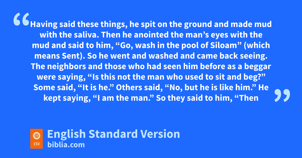 8 The neighbors and those who had seen him before as a beggar were saying, o“Is this not the man who used to sit and beg?” 9 Some said, “It is he.” Others said, “No, but he is like him.” He kept saying, “I am the man.” 10 So they said to him, “Then how were your eyes opened?” 11 He answered, p“The man called Jesus made mud and anointed my eyes and said to me, ‘Go to Siloam and wash.’ So I went and washed and received my sight.” 12 They said to him, “Where is he?” He said, “I do not know.”