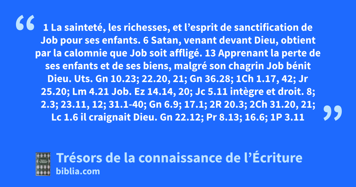 1 La sainteté, les richesses, et l’esprit de sanctification de Job pour ses enfants. 6 Satan, venant devant Dieu, obtient par la calomnie que Job soit affligé. 13 Apprenant la perte de ses enfants et de ses biens, malgré son chagrin Job bénit Dieu.