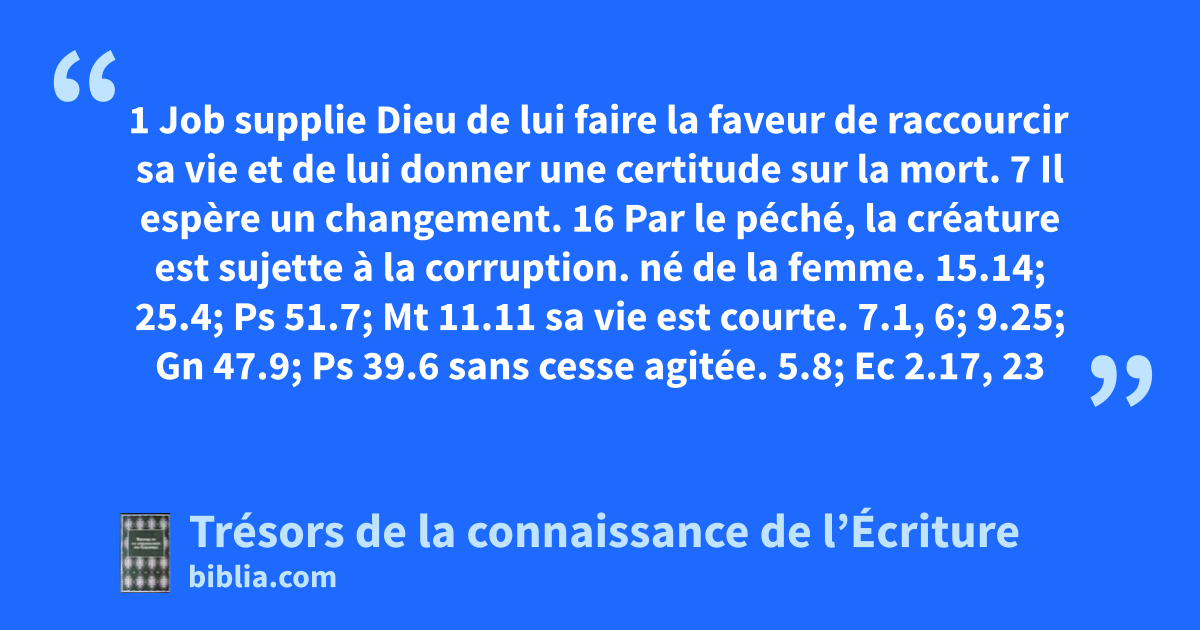 1 Job supplie Dieu de lui faire la faveur de raccourcir sa vie et de lui donner une certitude sur la mort. 7 Il espère un changement. 16 Par le péché, la créature est sujette à la corruption.