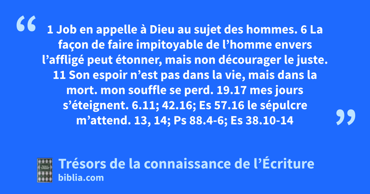 1 Job en appelle à Dieu au sujet des hommes. 6 La façon de faire impitoyable de l’homme envers l’affligé peut étonner, mais non décourager le juste. 11 Son espoir n’est pas dans la vie, mais dans la mort.