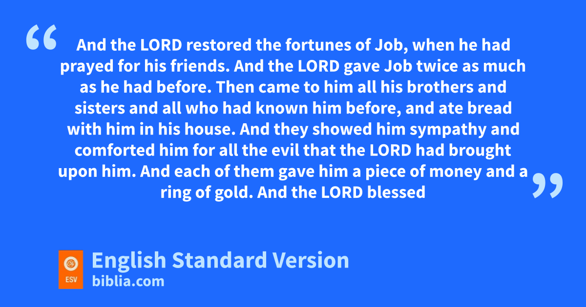 10 And the Lord rrestored the fortunes of Job, when he had prayed for his friends. And the Lord gave Job stwice as much as he had before. 11 Then came to him all his tbrothers and sisters and all who had tknown him before, and ate bread with him in his house. And they ushowed him sympathy and comforted him for all the evil2 that the Lord had brought upon him. And each of them gave him va piece of money3 and wa ring of gold.