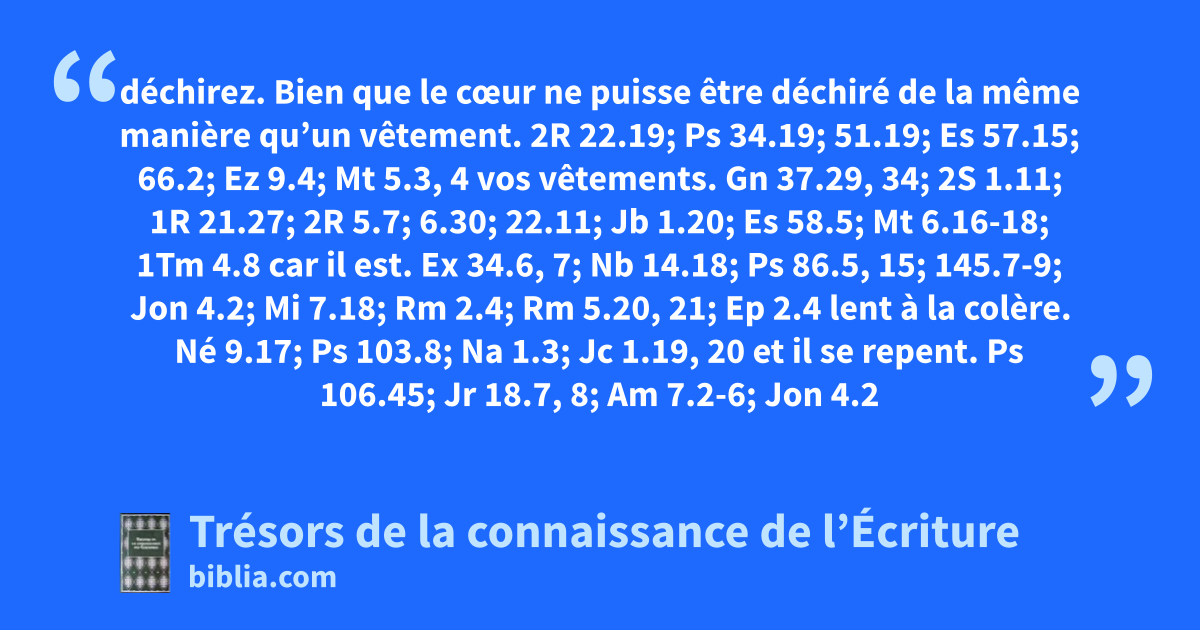 déchirez. Bien que le cœur ne puisse être déchiré de la même manière qu’un vêtement. 2R 22.19; Ps 34.19; 51.19; Es 57.15; 66.2; Ez 9.4; Mt 5.3, 4 vos vêtements. Gn 37.29, 34; 2S 1.11; 1R 21.27; 2R 5.7; 6.30; 22.11; Jb 1.20; Es 58.5; Mt 6.16-18; 1Tm 4.8 car il est. Ex 34.6, 7; Nb 14.18; Ps 86.5, 15; 145.7-9; Jon 4.2; Mi 7.18; Rm 2.4; Rm 5.20, 21; Ep 2.4 lent à la colère. Né 9.17; Ps 103.8; Na 1.3; Jc 1.19, 20 et il se repent. Ps 106.45; Jr 18.7, 8; Am 7.2-6; Jon 4.2