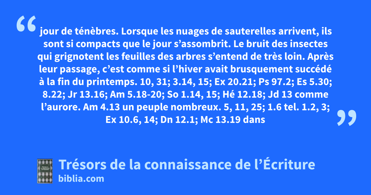 jour de ténèbres. Lorsque les nuages de sauterelles arrivent, ils sont si compacts que le jour s’assombrit. Le bruit des insectes qui grignotent les feuilles des arbres s’entend de très loin. Après leur passage, c’est comme si l’hiver avait brusquement succédé à la fin du printemps. 10, 31; 3.14, 15; Ex 20.21; Ps 97.2; Es 5.30; 8.22; Jr 13.16; Am 5.18-20; So 1.14, 15; Hé 12.18; Jd 13 comme l’aurore. Am 4.13 un peuple nombreux. 5, 11, 25; 1.6 tel. 1.2, 3; Ex 10.6, 14; Dn 12.1; Mc 13.19 dans la suite des âges. Dt 32.7; Ps 10.6