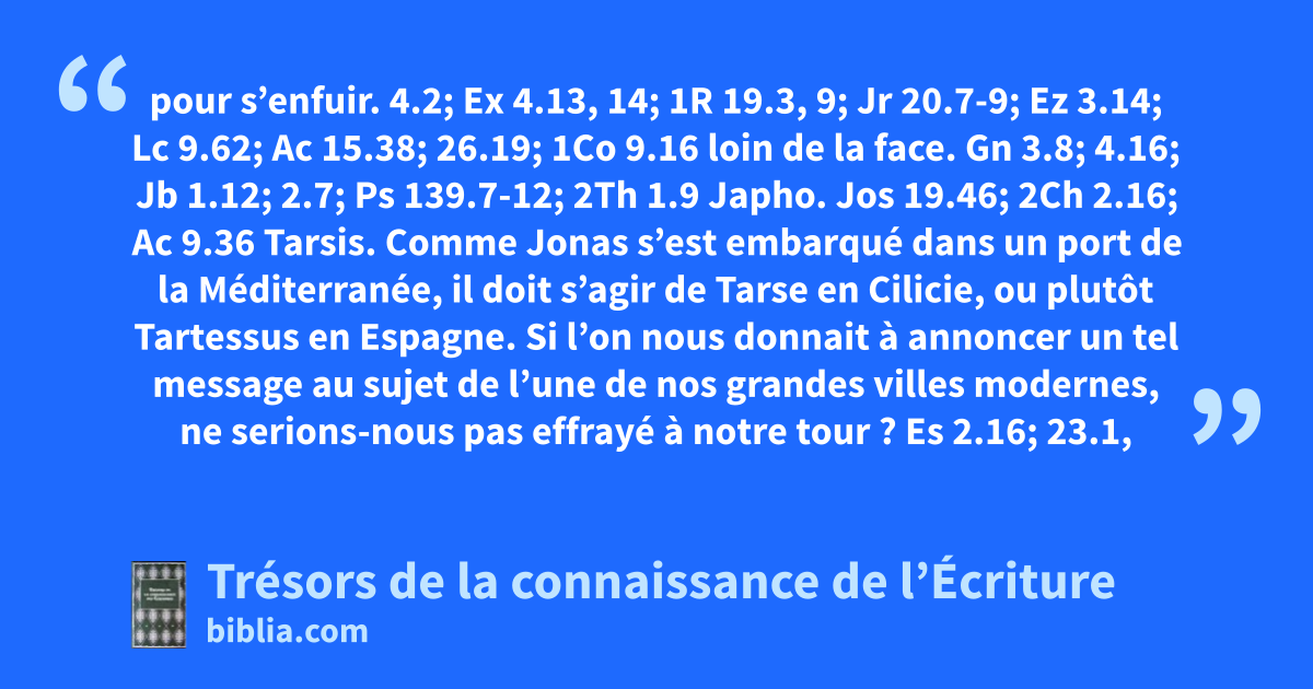 pour s’enfuir. 4.2; Ex 4.13, 14; 1R 19.3, 9; Jr 20.7-9; Ez 3.14; Lc 9.62; Ac 15.38; 26.19; 1Co 9.16 loin de la face. Gn 3.8; 4.16; Jb 1.12; 2.7; Ps 139.7-12; 2Th 1.9 Japho. Jos 19.46; 2Ch 2.16; Ac 9.36 Tarsis. Comme Jonas s’est embarqué dans un port de la Méditerranée, il doit s’agir de Tarse en Cilicie, ou plutôt Tartessus en Espagne. Si l’on nous donnait à annoncer un tel message au sujet de l’une de nos grandes villes modernes, ne serions-nous pas effrayé à notre tour ? Es 2.16; 23.1, 6, 10; 60.9; Ez 27.12