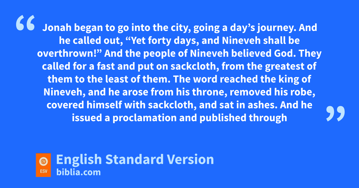 3 Then the word of the Lord came to Jonah the second time, saying, 2 “Arise, go to lNineveh, that great city, and call out against it the message that I tell you.” 3 So Jonah arose and went to Nineveh, according to the word of the Lord. Now lNineveh was an exceedingly great city,1 three days’ journey in breadth.2 4 Jonah began to go into the city, going a day’s journey. And he called out, “Yet forty days, and Nineveh shall be overthrown!” 5 mAnd the people of Nineveh believed God. nThey called for a fast and oput on sackcloth, from the greatest of them to the least of them.