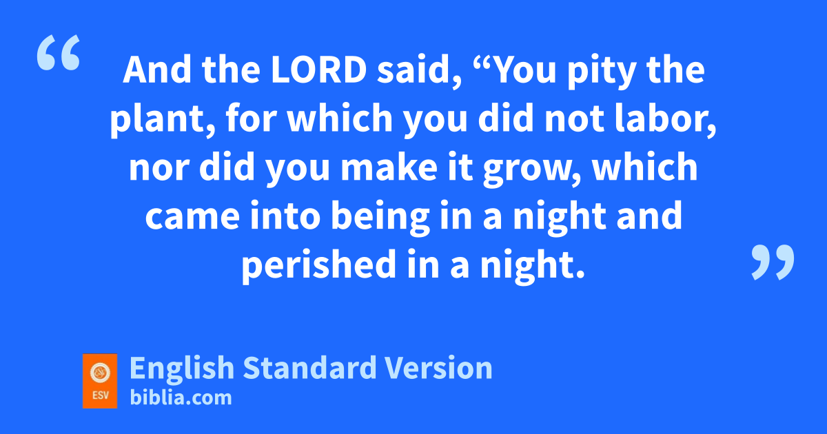 5 Jonah went out of the city and sat to the east of the city and emade a booth for himself there. He sat under it in the shade, till he should see what would become of the city. 6 Now the Lord God appointed a plant2 and made it come up over Jonah, that it might be a shade over his head, to save him from his discomfort.3 So Jonah was exceedingly glad because of the plant. 7 But when dawn came up the next day, God appointed a worm that attacked the plant, so that it withered. 8 When the sun rose, God appointed a scorching feast wind, gand the sun beat down on the head of Jonah so that he hwas faint. And he asked that he might die and said, c“It is better for me to die than to live.” 9 But God said to Jonah, i“Do you do well to be angry for the plant?” And he said, “Yes, I do well to be angry, angry enough to die.” 10 And the Lord said, “You pity the plant, for which you did not labor, nor did you make it grow, which came into being in a night and perished in a night. 11 And should not I pity jNineveh, that great city, in which there are more than 120,000 persons who do not know their right hand from their left, and also much kcattle?”