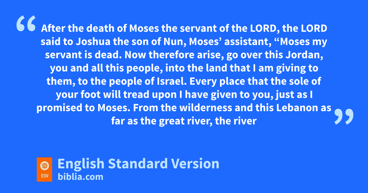 1 After the death of Moses the aservant of the Lord, the Lord said to Joshua the son of Nun, Moses’ bassistant, 2 “Moses my servant is dead. Now therefore arise, go over this Jordan, you and all this people, into the land that I am giving to them, to the people of Israel. 3 cEvery place that the sole of your foot will tread upon I have given to you, just as I promised to Moses. 4 dFrom the wilderness and this Lebanon as far as the great river, the river Euphrates, all the land of the Hittites to the Great Sea toward the going down of the sun shall be your territory. 5 eNo man shall be able to stand before you all the days of your life. Just fas I was with Moses, so gI will be with you. hI will not leave you or forsake you. 6 iBe strong and courageous, for you shall cause this people to inherit the land that I swore to their fathers to give them. 7 Only be strong and jvery courageous, being careful to do according to all the law kthat Moses my servant commanded you. lDo not turn from it to the right hand or to the left, that you may have good success1 wherever you go. 8 This Book of the Law shall not depart from your mouth, but myou shall meditate on it day and night, so that you may be careful to do according to all that is written in it. For then you will make your way prosperous, and then you will have good success. 9 Have I not commanded you? nBe strong and courageous. oDo not be frightened, and do not be dismayed, for the Lord your God is with you wherever you go.”
