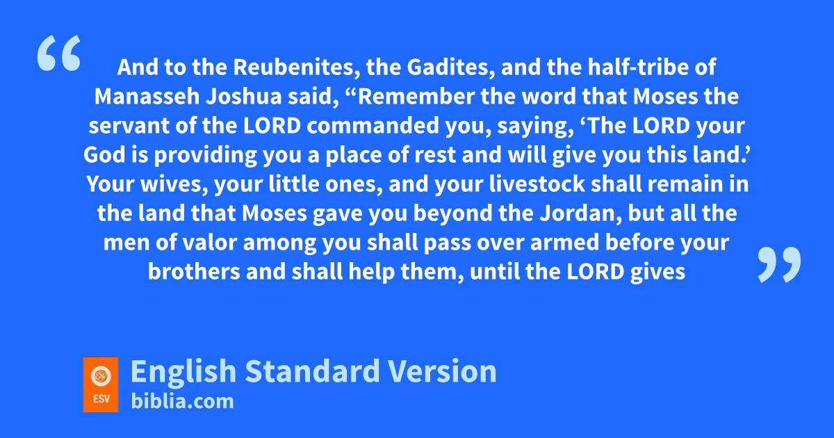 12 And to the Reubenites, the Gadites, and the half-tribe of Manasseh Joshua said, 13 “Remember the word that sMoses the servant of the Lord commanded you, saying, ‘The Lord your God is providing you a place of rest and will give you this land.’ 14 Your wives, your little ones, and your livestock shall remain in the land that Moses gave you beyond the Jordan, but all the men of valor among you shall pass over armed before your brothers and shall help them, 15 tuntil the Lord gives rest to your brothers as he has to you, and they also take possession of the land that the Lord your God is giving them. uThen you shall return to the land of your possession and shall possess it, the land that Moses the servant of the Lord gave you beyond the Jordan toward the sunrise.”