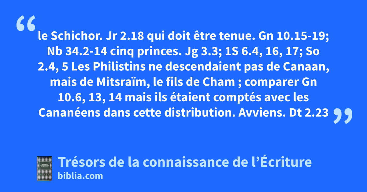 le Schichor. Jr 2.18 qui doit être tenue. Gn 10.15-19; Nb 34.2-14 cinq princes. Jg 3.3; 1S 6.4, 16, 17; So 2.4, 5 Les Philistins ne descendaient pas de Canaan, mais de Mitsraïm, le fils de Cham ; comparer Gn 10.6, 13, 14 mais ils étaient comptés avec les Cananéens dans cette distribution. Avviens. Dt 2.23
