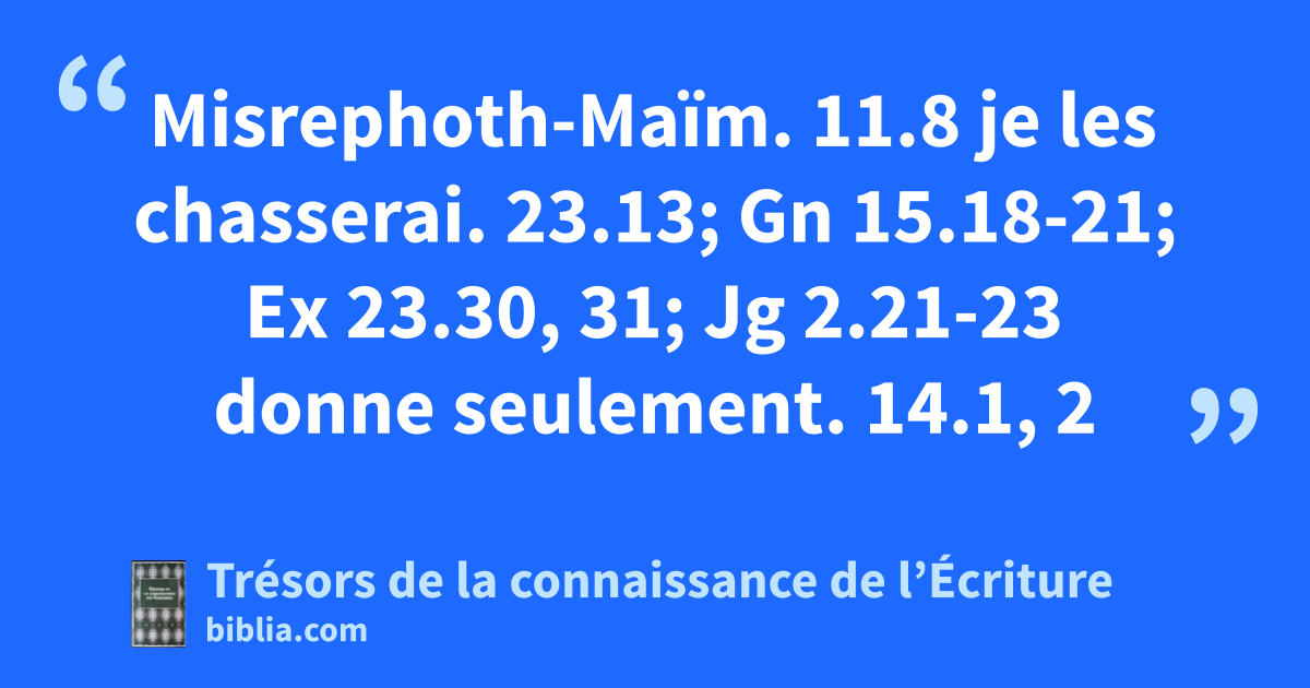 Misrephoth-Maïm. 11.8 je les chasserai. 23.13; Gn 15.18-21; Ex 23.30, 31; Jg 2.21-23 donne seulement. 14.1, 2