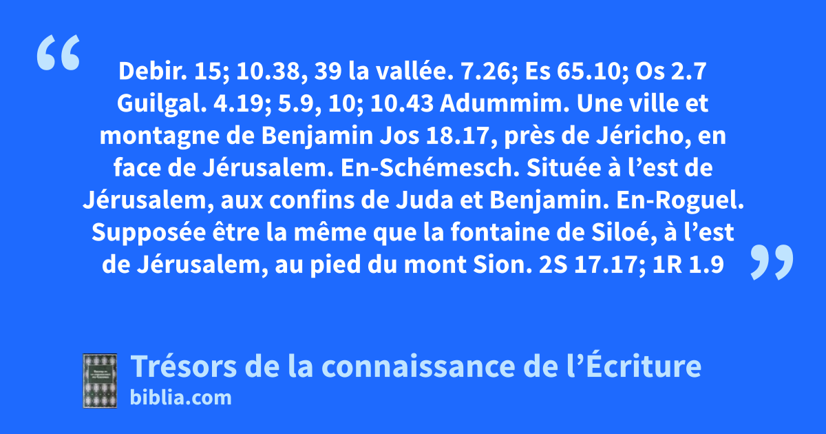 Debir. 15; 10.38, 39 la vallée. 7.26; Es 65.10; Os 2.7 Guilgal. 4.19; 5.9, 10; 10.43 Adummim. Une ville et montagne de Benjamin Jos 18.17, près de Jéricho, en face de Jérusalem. En-Schémesch. Située à l’est de Jérusalem, aux confins de Juda et Benjamin. En-Roguel. Supposée être la même que la fontaine de Siloé, à l’est de Jérusalem, au pied du mont Sion. 2S 17.17; 1R 1.9
