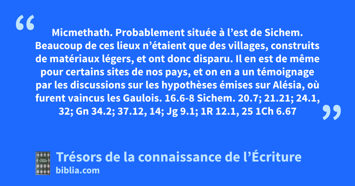 Micmethath. Probablement située à l’est de Sichem. Beaucoup de ces lieux n’étaient que des villages, construits de matériaux légers, et ont donc disparu. Il en est de même pour certains sites de nos pays, et on en a un témoignage par les discussions sur les hypothèses émises sur Alésia, où furent vaincus les Gaulois. 16.6-8 Sichem. 20.7; 21.21; 24.1, 32; Gn 34.2; 37.12, 14; Jg 9.1; 1R 12.1, 25 1Ch 6.67