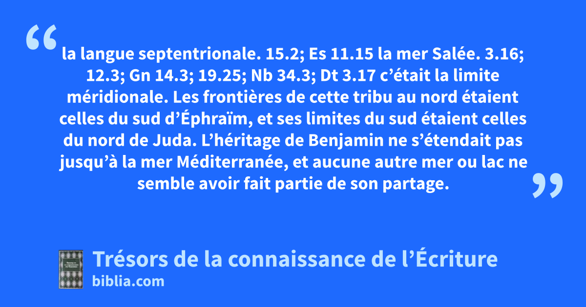 la langue septentrionale. 15.2; Es 11.15 la mer Salée. 3.16; 12.3; Gn 14.3; 19.25; Nb 34.3; Dt 3.17 c’était la limite méridionale. Les frontières de cette tribu au nord étaient celles du sud d’Éphraïm, et ses limites du sud étaient celles du nord de Juda. L’héritage de Benjamin ne s’étendait pas jusqu’à la mer Méditerranée, et aucune autre mer ou lac ne semble avoir fait partie de son partage.