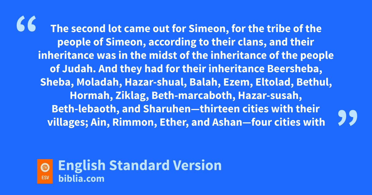 19 The second lot came out for Simeon, for the tribe of the people of Simeon, according to their clans, pand their inheritance was in the midst of the inheritance of the people of Judah. 2 qAnd they had for their inheritance Beersheba, Sheba, Moladah, 3 Hazar-shual, Balah, Ezem, 4 Eltolad, Bethul, Hormah, 5 Ziklag, Beth-marcaboth, Hazar-susah, 6 Beth-lebaoth, and Sharuhen—thirteen cities with their villages; 7 Ain, Rimmon, Ether, and Ashan—four cities with their villages, 8 together with all the villages around these cities as far as Baalath-beer, Ramah of the Negeb. This was the inheritance of the tribe of the people of Simeon according to their clans. 9 rThe inheritance of the people of Simeon formed part of the territory of the people of Judah. Because the portion of the people of Judah was too large for them, the people of Simeon obtained an inheritance in the midst of their inheritance.