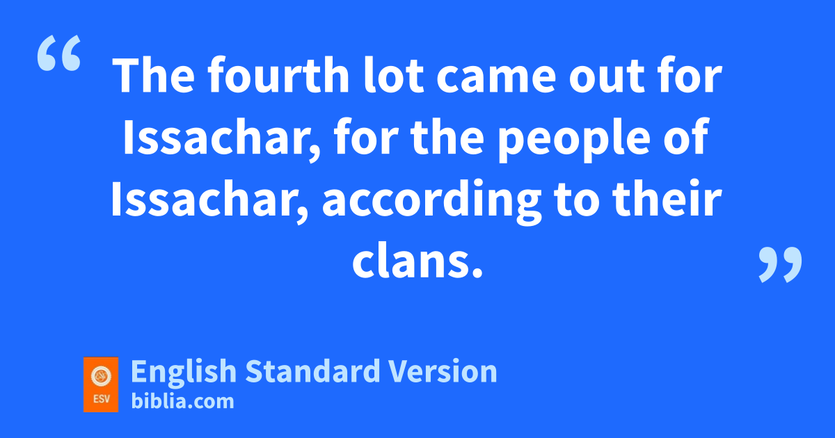 17 The fourth lot came out for Issachar, for the people of Issachar, according to their clans. 18 Their territory included Jezreel, Chesulloth, vShunem, 19 Hapharaim, Shion, Anaharath, 20 Rabbith, Kishion, Ebez, 21 Remeth, En-gannim, En-haddah, Beth-pazzez. 22 The boundary also touches Tabor, Shahazumah, and Beth-shemesh, and its boundary ends at the Jordan—sixteen cities with their villages. 23 This is the inheritance of the tribe of the people of Issachar, according to their clans—the cities with their villages.