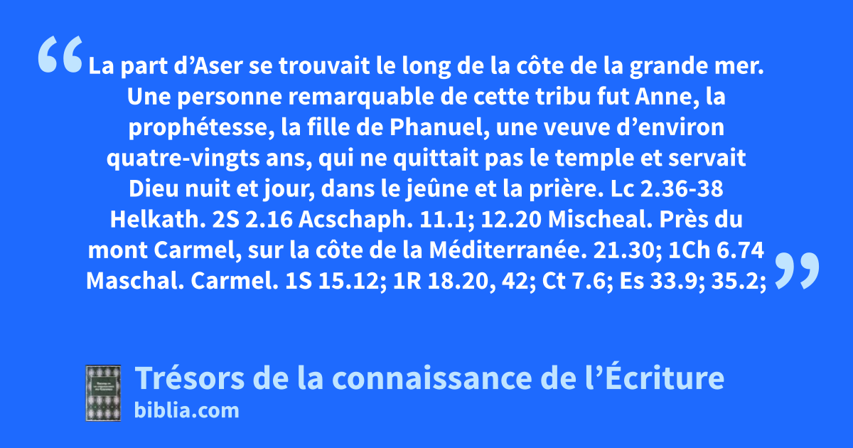 La part d’Aser se trouvait le long de la côte de la grande mer. Une personne remarquable de cette tribu fut Anne, la prophétesse, la fille de Phanuel, une veuve d’environ quatre-vingts ans, qui ne quittait pas le temple et servait Dieu nuit et jour, dans le jeûne et la prière. Lc 2.36-38