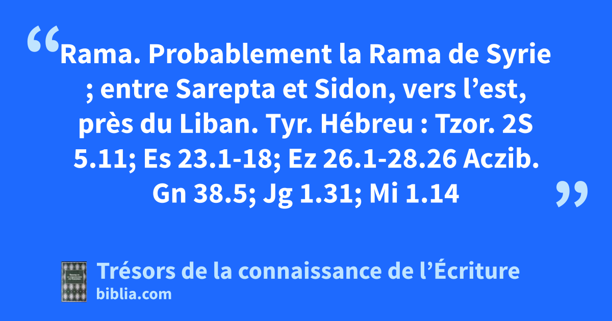 Rama. Probablement la Rama de Syrie ; entre Sarepta et Sidon, vers l’est, près du Liban. Tyr. Hébreu : Tzor. 2S 5.11; Es 23.1-18; Ez 26.1-28.26 Aczib. Gn 38.5; Jg 1.31; Mi 1.14
