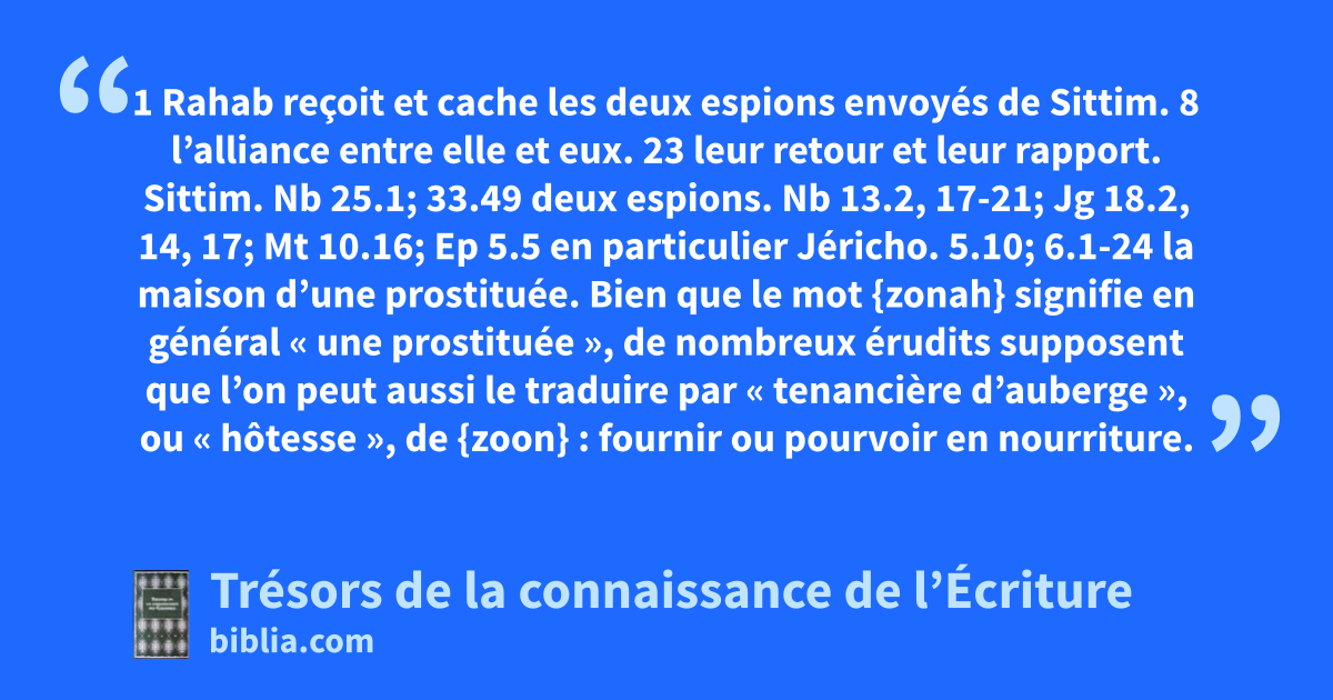 Sittim. Nb 25.1; 33.49 deux espions. Nb 13.2, 17-21; Jg 18.2, 14, 17; Mt 10.16; Ep 5.5 en particulier Jéricho. 5.10; 6.1-24 la maison d’une prostituée. Bien que le mot {zonah} signifie en général « une prostituée », de nombreux érudits supposent que l’on peut aussi le traduire par « tenancière d’auberge », ou « hôtesse », de {zoon} : fournir ou pourvoir en nourriture. Dans l’antiquité, les femmes étaient responsables des maisons d’amusements, tenaient les tavernes, tandis que leurs époux pouvaient être tisserands à domicile. 6.17, 25; Mt 1.5 Rahab. 21.31; Hé 11.31; Jc 2.25