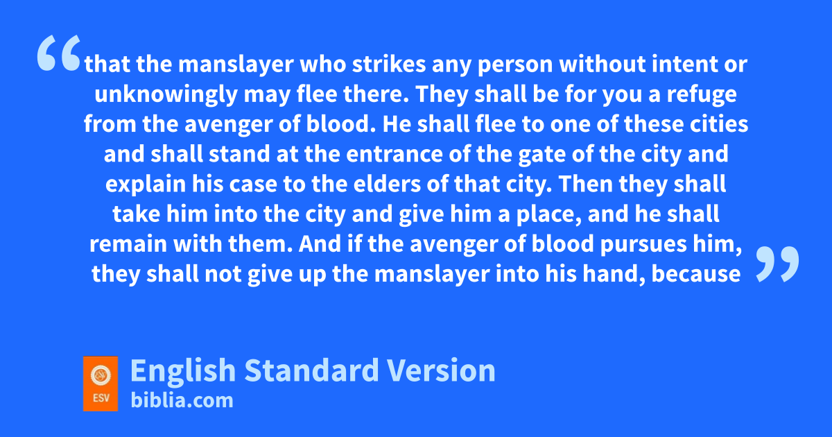 20 Then the Lord said to Joshua, 2 “Say to the people of Israel, j‘Appoint the cities of refuge, of which I spoke to you through Moses, 3 that the manslayer who strikes any person without intent or unknowingly may flee there. They shall be for you a refuge from the avenger of blood. 4 He shall flee to one of these cities and shall stand kat the entrance of the gate of the city and explain his case to the elders of that city. Then they shall take him into the city and give him a place, and he shall remain with them. 5 And if the avenger of blood pursues him, they shall not give up the manslayer into his hand, because he struck his neighbor unknowingly, and did not hate him in the past. 6 And he shall remain in that city luntil he has stood before the congregation for judgment, until the death of him who is high priest at the time. Then the manslayer may return to his own town and his own home, to the town from which he fled.’ ”