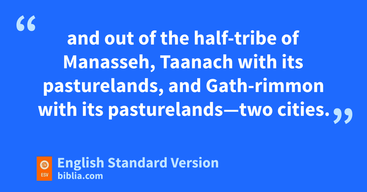 20 kAs to the rest of the Kohathites belonging to the Kohathite clans of the Levites, the cities allotted to them were out of the tribe of Ephraim. 21 To them were given Shechem, lthe city of refuge for the manslayer, with its pasturelands in the hill country of Ephraim, Gezer with its pasturelands, 22 Kibzaim with its pasturelands, Beth-horon with its pasturelands—four cities; 23 and out of the tribe of Dan, Elteke with its pasturelands, Gibbethon with its pasturelands, 24 Aijalon with its pasturelands, Gath-rimmon with its pasturelands—four cities; 25 and out of the half-tribe of Manasseh, Taanach with its pasturelands, and Gath-rimmon with its pasturelands—two cities. 26 The cities of the clans of the rest of the Kohathites were ten in all with their pasturelands.